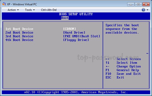 Select 1st Boot Device and press Enter. From the pop-up menu, choose CDROM as we need to boot with a CD or ISO image. When done, press the F10 key to save and exit.