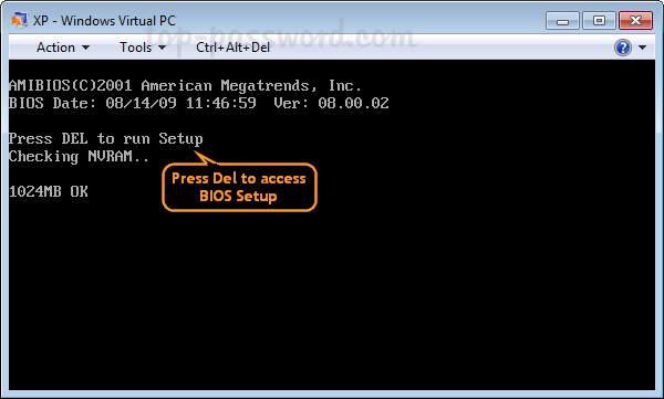 Turn on or restart your virtual machine. When the POST screen comes up (as shown in the image below), press the DEL key to enter into BIOS Setup.