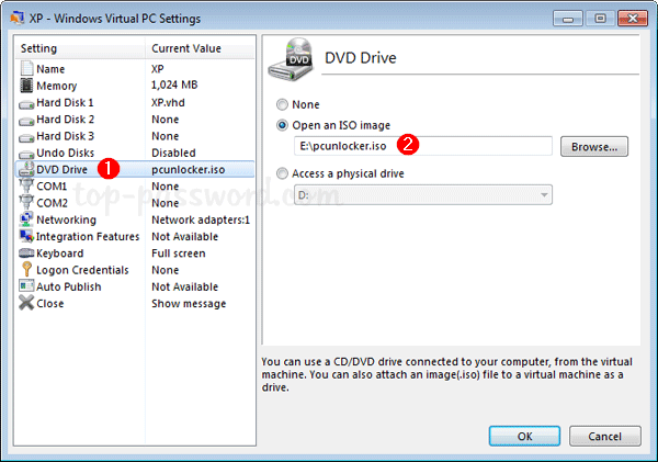 Select DVD Drive in the left pane. Next, check the "Open an ISO image" option and click the Browse button to locate the pcunlocker.iso file.