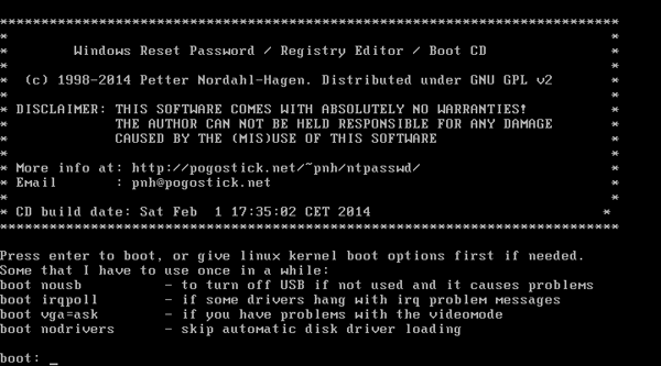 After chntpw startup, you will see the first screen which shows copyright information and driver option information. Just press Enter to continue.
