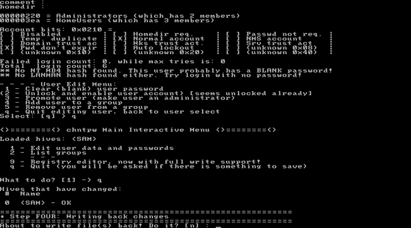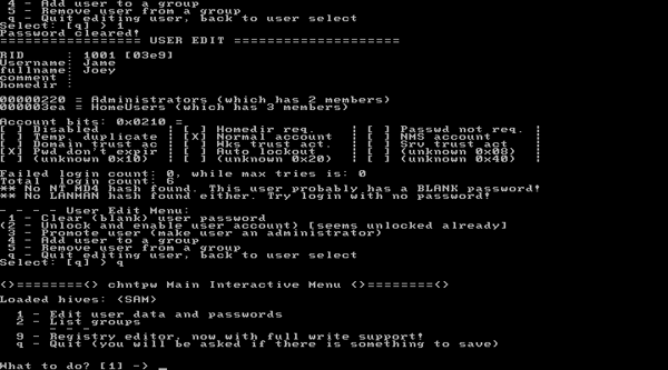 You should see the message "Password cleared!". Type ! to quit editing user and then press Enter.