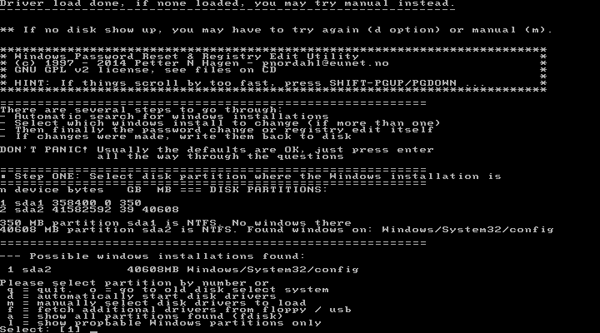 Chntpw will display all Windows installations along with the partitions detected on your computer. Select the partition that contains the Windows 7 installation that you want to delete a password from.