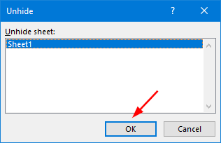 - In the Unhide dialog box, you can see all of the currently hidden sheets in the list box. Select a sheet you want to unhide and click OK.