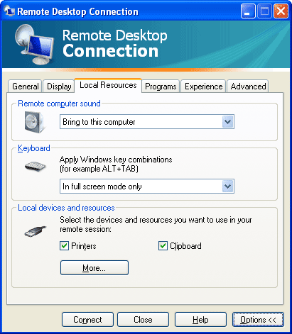 - Make sure the Clipboard is checked, so the Rdpclip utility will be automatically started in your remote computer after setting up a remote desktop connection.