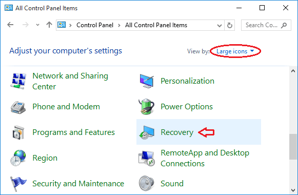 2. Select the View by option at the top right of the Control Panel. Set it to Large icons. Next click Recovery.