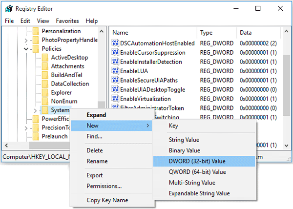 3. Right-click on the System key on the left pane and select New -> DWORD (32 bit) Value.