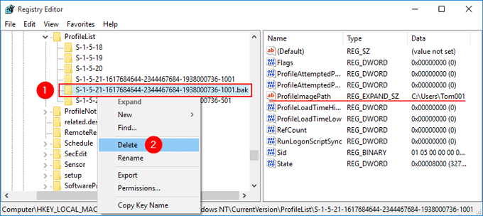 Expand the ProfileList subkey, you will see the SID keys for all the users on the machine. As we’ve found the SID of your affected account above, just click that SID key (without .bak), you’ll see the “ProfileImagePath” entry in the right pane that points to a temporary profile.