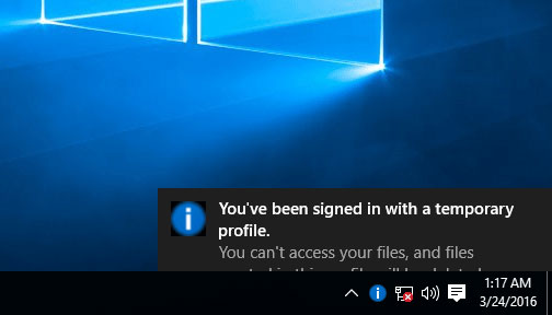 “You’ve been signed in with a temporary profile. You can’t access your files, and files created in this profile will be deleted when you sign out. To fix this, sign out and try signing in later. Please see the event log for more details or contact your system administrator.”