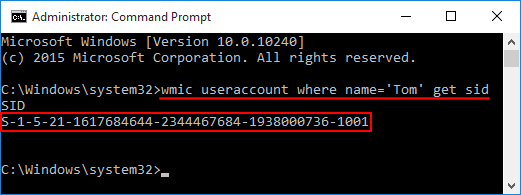 When the Command Prompt launches, type the following command, replacing Tom with the name of your affected account. Press Enter and you’ll see the SID that will be used in steps below.