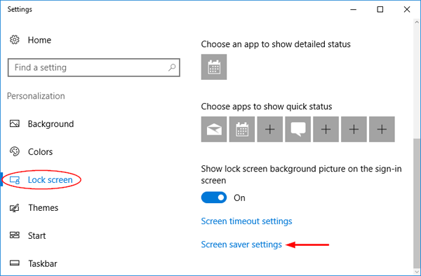 - It now opens up the Personalization settings. Click on Lock screen in the left pane, then click the Screen saver settings link in the right pane.