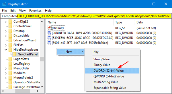 HKEY_CURRENT_USER\Software\Microsoft\Windows\CurrentVersion\Explorer\HideDesktopIcons\NewStartPanel - On the right pane of the window, right-click on the blank area and select New -> DWORD (32-bit) Value.