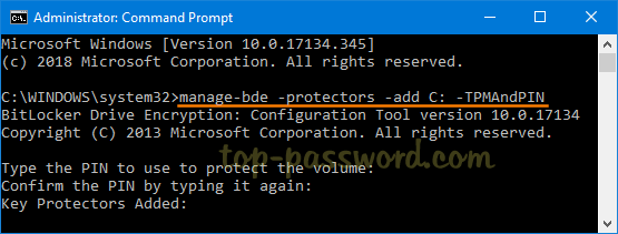 - Open an elevated Command Prompt and run the following command to add a pre-boot PIN for your BitLocker-encrypted OS drive. Make sure you set a strong PIN that you can remember.