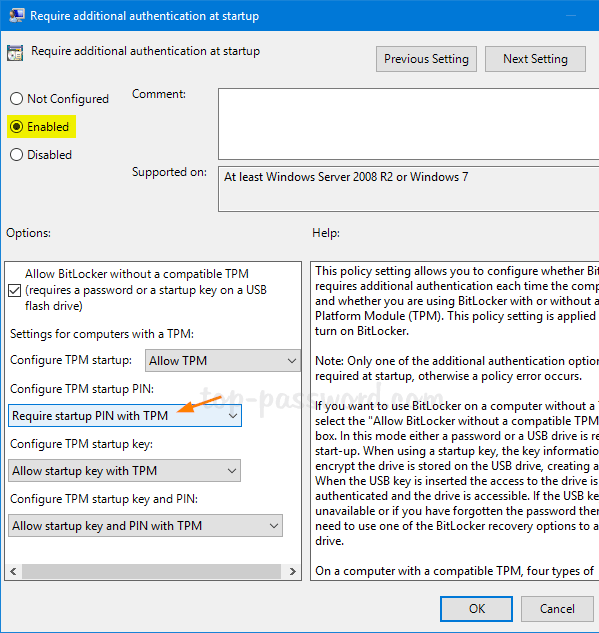 - Now you should select Enabled. Under “Configure TPM startup PIN”, select Require startup PIN with TPM. Click OK and then reboot the system.