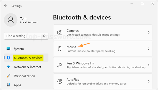 - Open the Settings app. Choose Bluetooth & devices on the left side, and click Mouse on the right pane.