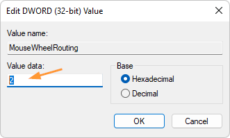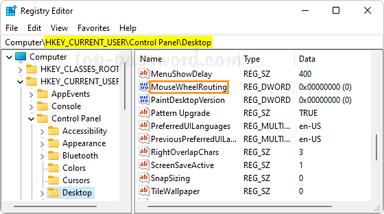 HKEY_CURRENT_USER\Control Panel\Desktop. Look for the 32-bit DWORD value named MouseWheelRouting, and then double-click it to modify.