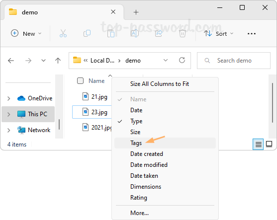 - You’ll be able to see the tags of all files. Click the down arrow to the right of the Tags column header.