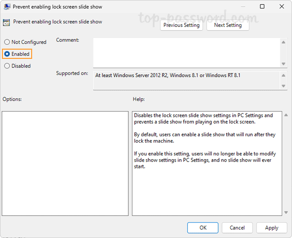 - Choose the Enabled option to turn off the slideshow feature, or select “Not Configured” if you don’t want to prevent the slideshow feature.