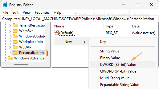 - Name the new key Personalization and select it. Next, right-click the blank area in the right pane and choose New -> DWORD (32-bit) Value.
