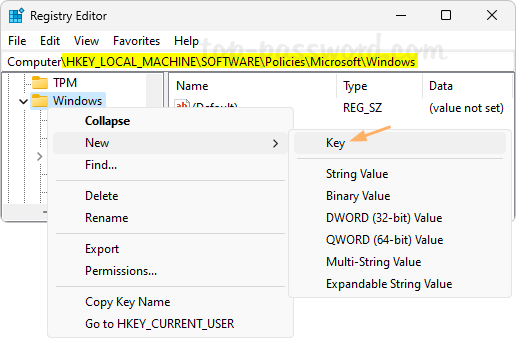 HKEY_LOCAL_MACHINE\SOFTWARE\Policies\Microsoft\Windows. Right-click the Windows key in the left sidebar and choose New -> Key.