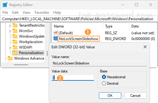 - Name the DWORD NoLockScreenSlideshow, and then double-click it and set its value data to 1. This will disable the slideshow feature and prevent a slide show from playing on the lock screen.