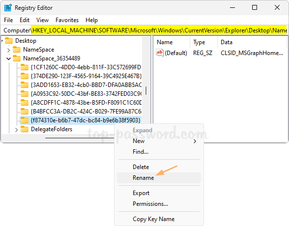 1. Open Registry Editor. Copy and paste the following registry path into the address bar for quick navigation. Right-click the {f874310e-b6b7-47dc-bc84-b9e6b38f5903} key and select Rename.
