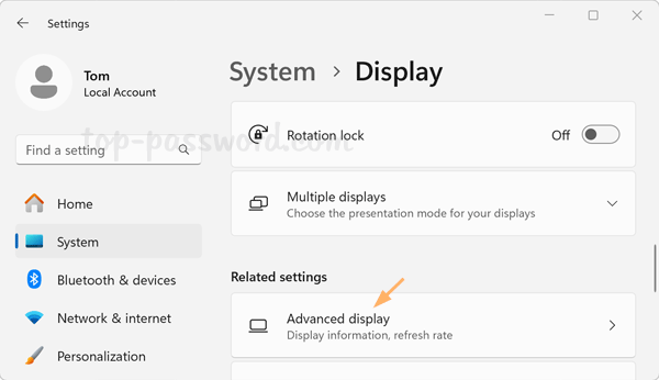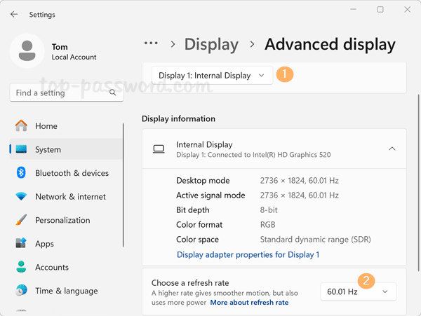 3. Under Display information, click the “Choose a refresh rate” drop-down menu and select the refresh rate you want. When multiple monitors are connected to your PC, you need to click the drop-down menu at the top to choose the monitor which you want to change the refresh rate for.