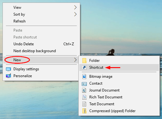 - Right-click in the empty space of your desktop, select New -> Shortcut.