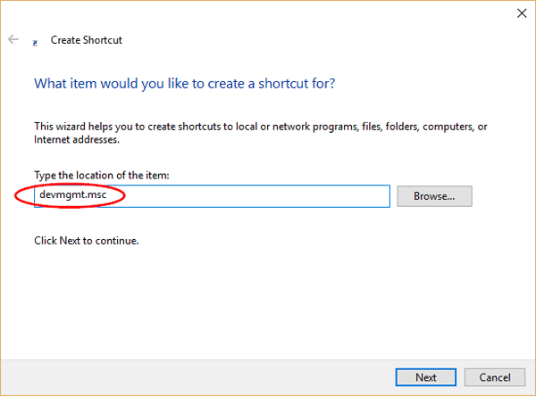 - Copy and paste devmgmt.msc in the location field and click Next.