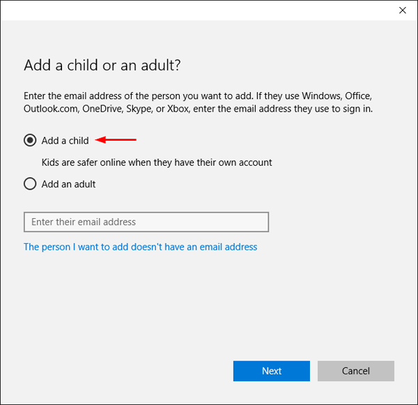 If your kids do not have a Microsoft account, click the “The person I want to add doesn’t have an email address” link to create a new Microsoft account for them.