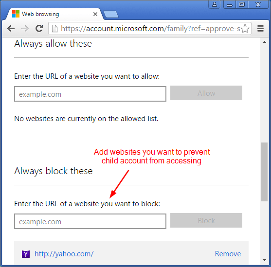 - Click the Web browsing tab and turn on “Block inappropriate websites“. Scroll down and you’ll find options for allowing specific websites, or alternatively blocking unwanted sites.