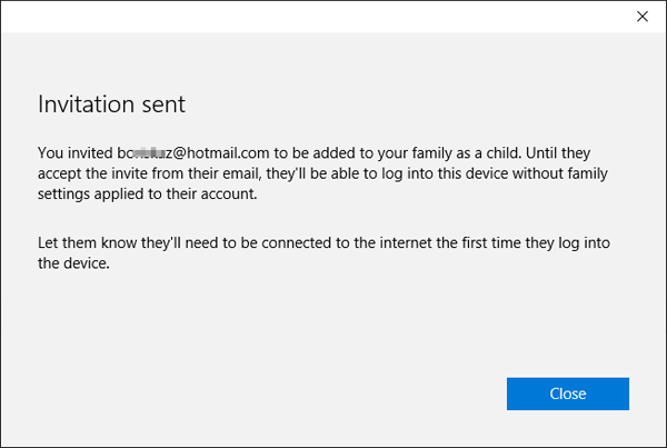 - Just after the confirmation, the invitation will be sent to your child’s email address. Click Close.