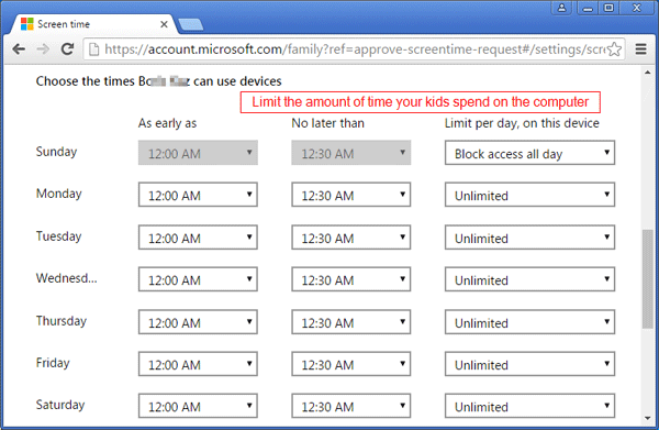 - Click the Screen time tab and you can limit the time your child has access to your PC. Turn on “Set limits for when my child can use devices“, and then set the earliest and latest times they’re allowed to use the computer for each day of the week.