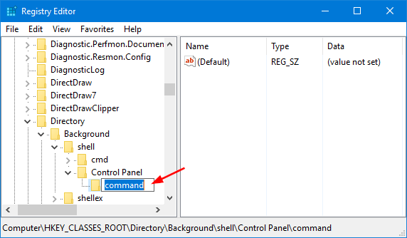 - Next, right-click on the newly-created “Control Panel” key and select New -> Key. Name the key command.