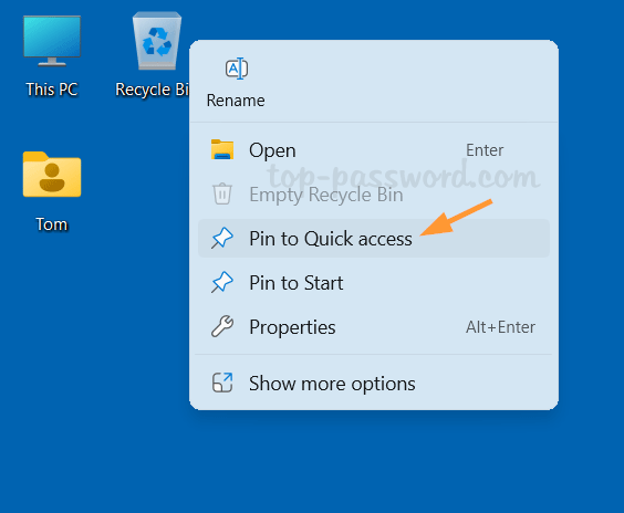 - Right-click the Recycle Bin icon on the desktop and select “Pin to Quick access” from the context menu.