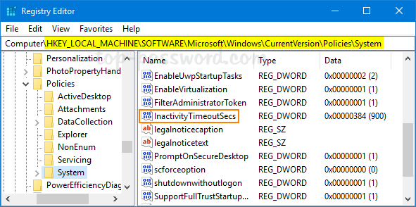 HKEY_LOCAL_MACHINE\SOFTWARE\Microsoft\Windows\CurrentVersion\Policies\System - In the right pane, look for the 32-bit DWORD InactivityTimeoutSecs and double-click it to modify. If it doesn’t exist, you have to create it.