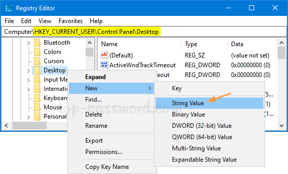 HKEY_CURRENT_USER\Control Panel\Desktop. In the left pane, right-click on the Desktop key and select New -> String Value.
