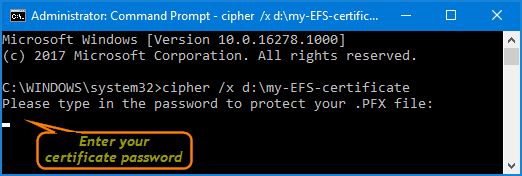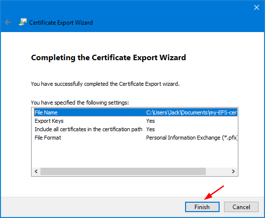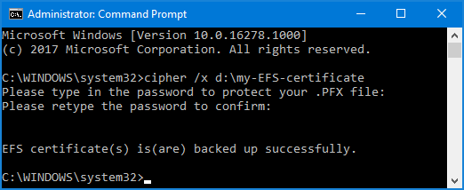 5. The .pfx file containing the EFS private key certificate is now saved to the location d:\my-EFS-certificate.