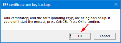 3. Once you press Enter, you’ll be prompted to confirm backing up EFS certificate. Click OK to continue.