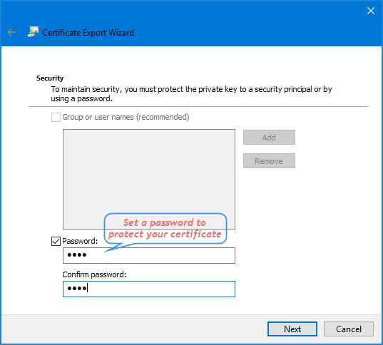 4. Type a password used for protecting your EFS certificate, then confirm the password.