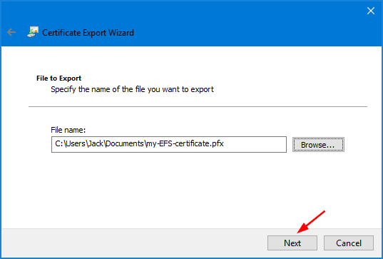 8. Click the Browse button to find a location to save your exported EFS certificate (.pfx). Type in a name such as “my-EFS-certificate.pfx” and then click Next.