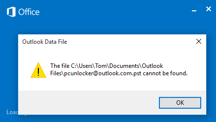 - Restart Outlook. An error dialog box appears that notifies you that an Outlook Data File (.pst) could not be found. Click OK.
