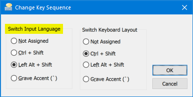 - Select the keyboard combination you would like to use for switching between languages, and click OK.