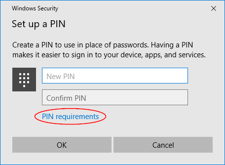 4. Once you are done setting up the PIN complexity, restart Windows 10 to make your changes take effect. Now when you try to set up a new PIN, you can see the “PIN requirements” link under the PIN box. Click the link and you can view the PIN complexity requirements configured on your computer.