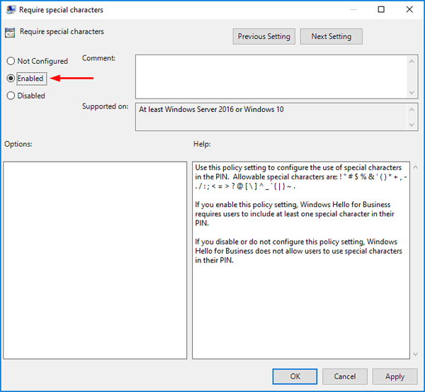 • Require special characters: Your PIN must contain at least one of these special characters: ! ” # $ % & ‘ ( ) * + , – . / : ; < = > ? @ [ \ ] ^ _ ` { | } ~ .