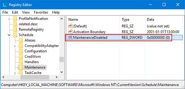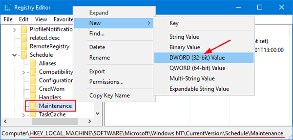 HKEY_LOCAL_MACHINE\SOFTWARE\Microsoft\Windows NT\CurrentVersion\Schedule\Maintenance - In the left pane, right-click on the Maintenance key, and then select New -> DWORD (32-bit) Value.