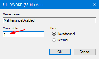 - Next, double-click on the new value to modify. In the Value data field, type 1 if you want to disable automatic maintenance (If you want to enable automatic maintenance again, just set its value to 0.) and click OK.
