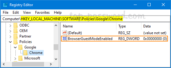 HKEY_LOCAL_MACHINE\SOFTWARE\Policies\Google\Chrome. By default, both the “Google” and “Chrome” keys don’t exist. You have to create them manually. - While the “Chrome” key is selected, right-click on the blank area in the right-hand pane, and create a 32-bit DWORD BrowserGuestModeEnabled and leave its value data to 0.