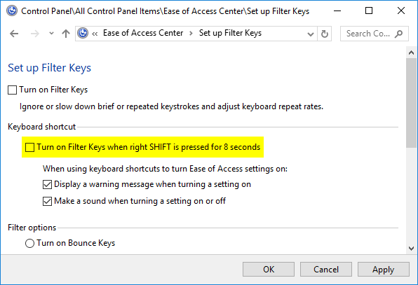 How to Disable Sticky / Filter Keys Permanently in Windows 10?