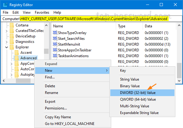 HKEY_CURRENT_USER\Software\Microsoft\Windows\CurrentVersion\Explorer\Advanced