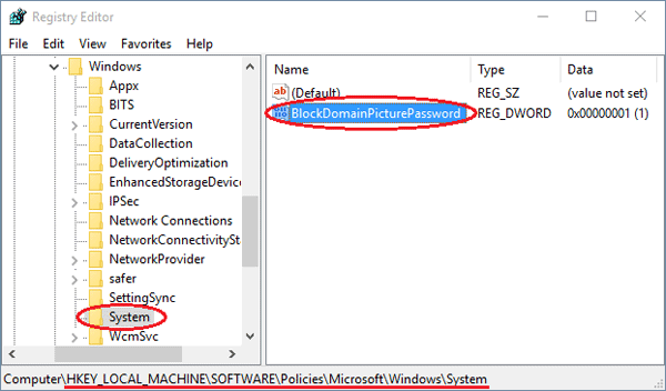 3. In right pane, look for an entry named BlockDomainPicturePassword. If it doesn’t exist, right-click on empty space and create a DWORD value and assign name as BlockDomainPicturePassword.
